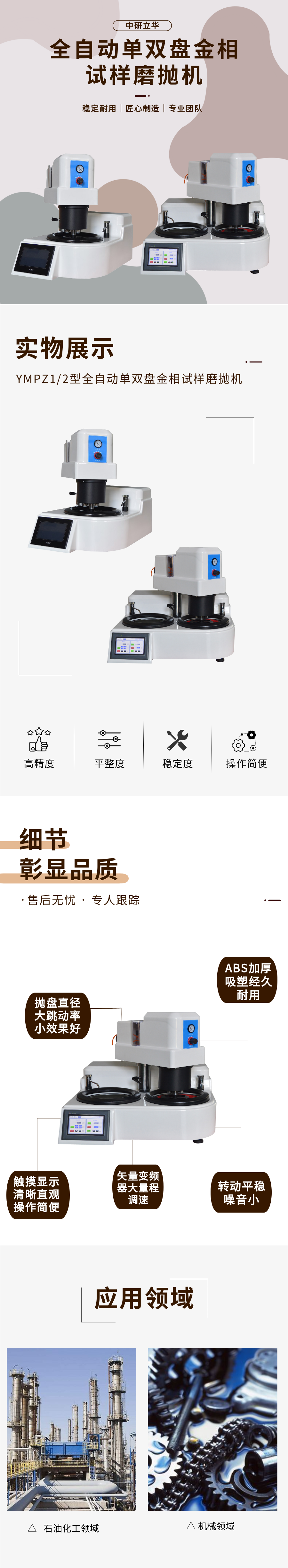 用途: 適用于金相試樣粗磨、精磨、精拋等各種金相加工全過程,可根據(jù)試樣條件自動調(diào)節(jié)對試樣進行加減壓式磨拋,高度自動化,人性化,極大程度減少人力投入,減少試樣磨拋過程中等各種問題