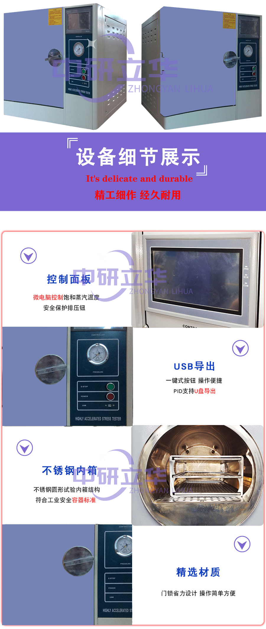 4. 圓幅內(nèi)襯,不銹鋼圓幅型內(nèi)襯設(shè)計(jì),可避免蒸氣潛熱直接沖擊試品