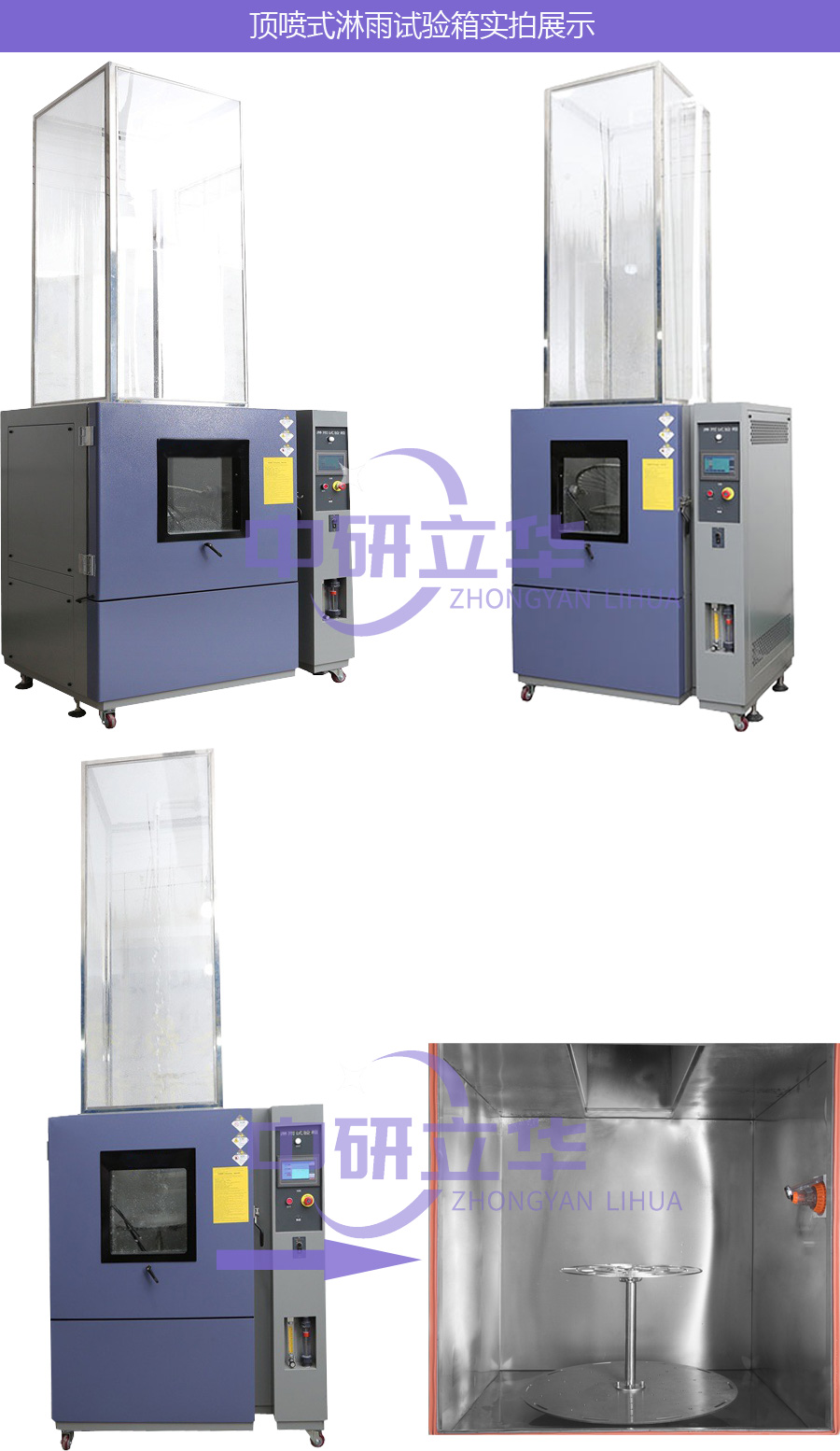 介紹:IP3-6頂噴式淋雨試驗箱模擬噴水環境,用于考核電工產品,外殼和密封在淋雨環境下能否保證設備和元件良好性能的試驗。